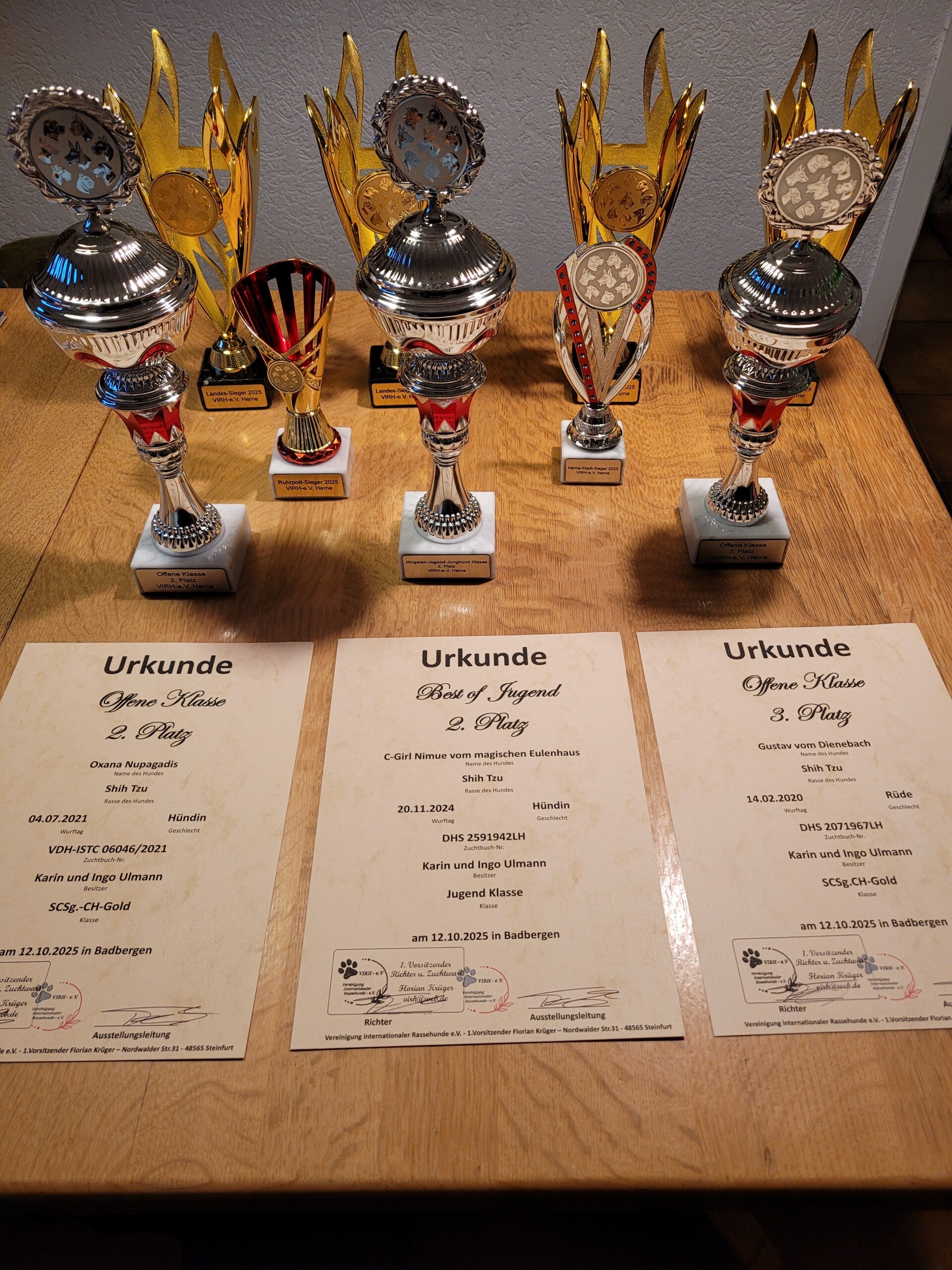 Zu Gast beim VIRH-e.V. in Herne 2024. Alle Hunde haben die Bestnoten bekommen. Außerdem gab es wieder Sonderpokale. Ophelia hat Platzt 1 Best of Breed. Gustav hat Platzt 3 Best of Show.